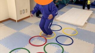 音楽が流れると、周りのお友だちや職員の拍手のリズムをよく聞きながら、紐の上をジグザグに跳ぶ動きに挑戦しました(*’▽’)