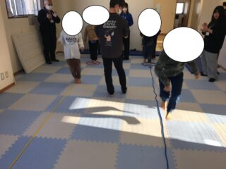 音楽が流れると、周りのお友だちや職員の拍手のリズムをよく聞きながら、紐の上をジグザグに跳ぶ動きに挑戦しました(*’▽’)