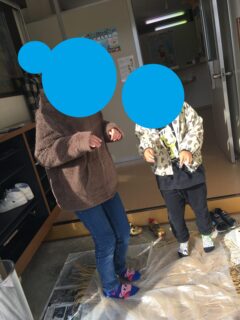 木槌で叩く役と霧吹きで水を掛ける役を交代で回し、最終的には足で踏むことで足底の感覚刺激も促していきました。