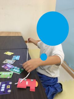 電車や動物などの絵カードを繋ぎ合わせていく課題となりますが、指先の細かな動きや両手の協調的な動き(カードを抑えて穴に紐を通す)、それに加えて目で捉えた場所に正確に手を動かす力が必要となります!
