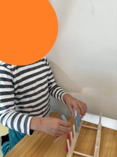これは木の棒にストローを刺していき、その上にビー玉を乗せるというものです。