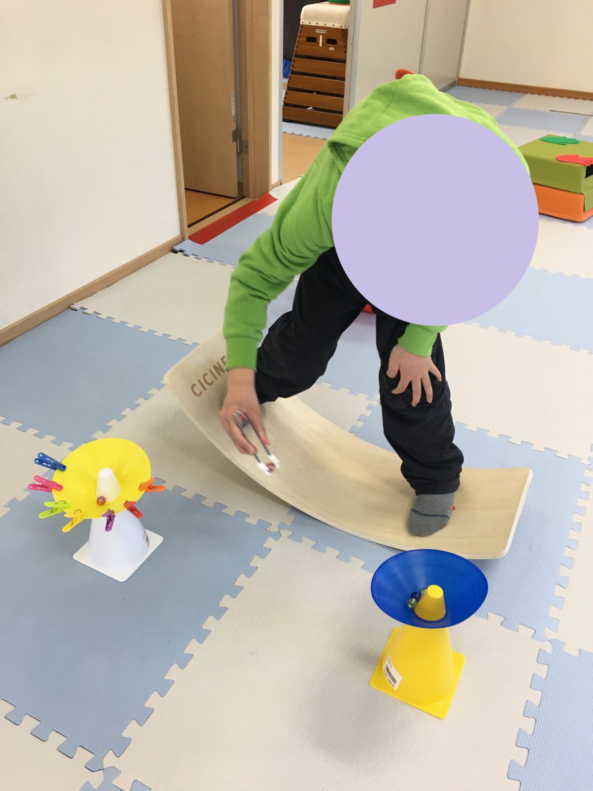 これはバランスボードに乗った状態でマーカーについている洗濯ばさみを反対のマーカーに移動していく課題となります。