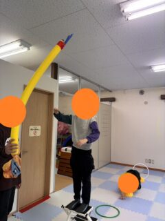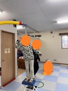 狙いとしては高所に登ることでの見え方等さまざまな感覚入力と、高所兼不安定な場所でのリーチ動作を促すことでその中での姿勢制御(バランスコントロール)となります。