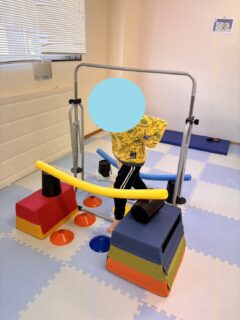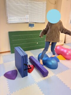 「バランスストーン」では、バランスストーンをジグザグに置いていたものを直線としたうえで、バランスボールや平行棒、クッションなどを置くことで跨ぎ動作を追加しました。